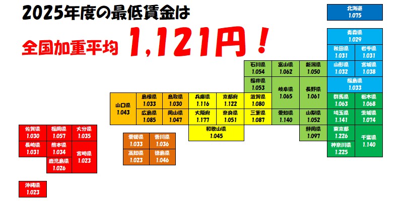 2025年度の最低賃金は1121円、全都道府県が1000円超え!
