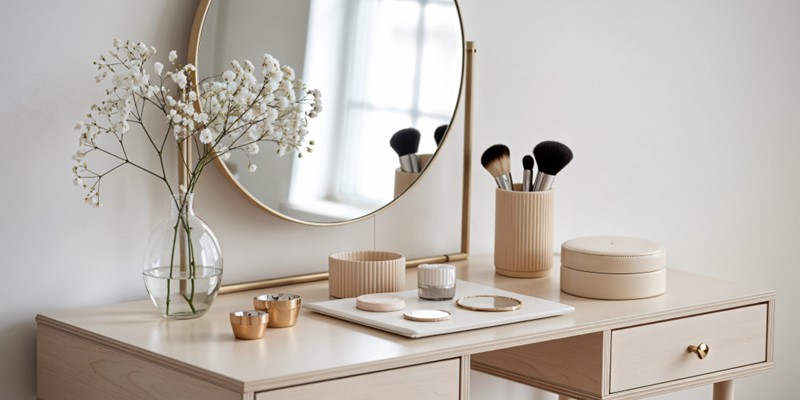 ドレッサーは、メイクや髪型を整えるための道具やアクセサリーなどを収納する家具です。鏡、化粧台、椅子、引き出しが備え付けられており、化粧台や鏡台とも呼ばれています(この記事では、ドレッサーで呼称を統一します)。