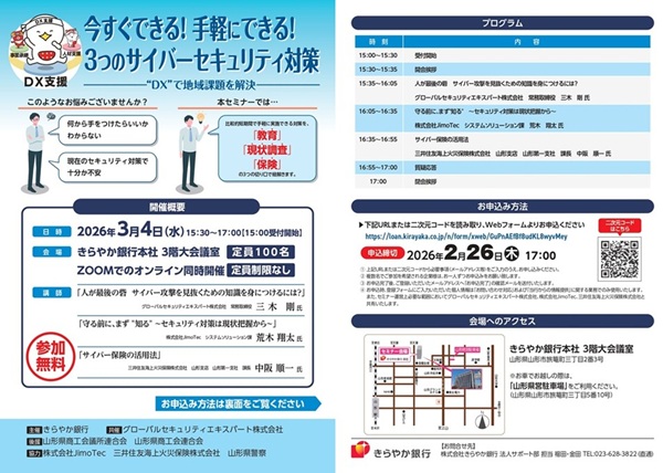2026年3月4日、きらやか銀行と、サイバーセキュリティサービスを提供しているグローバルセキュリティエキスパート(GSX)との共催で、サイバーセキュリティセミナーを開催します。