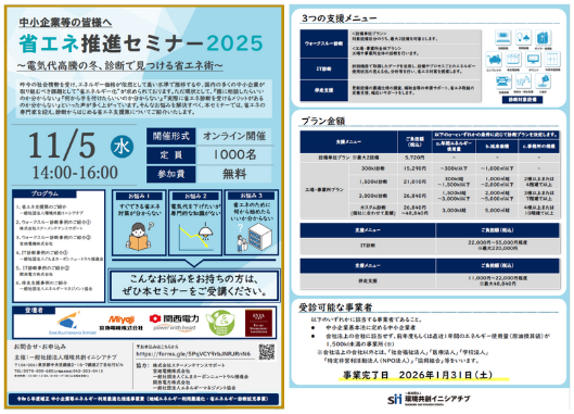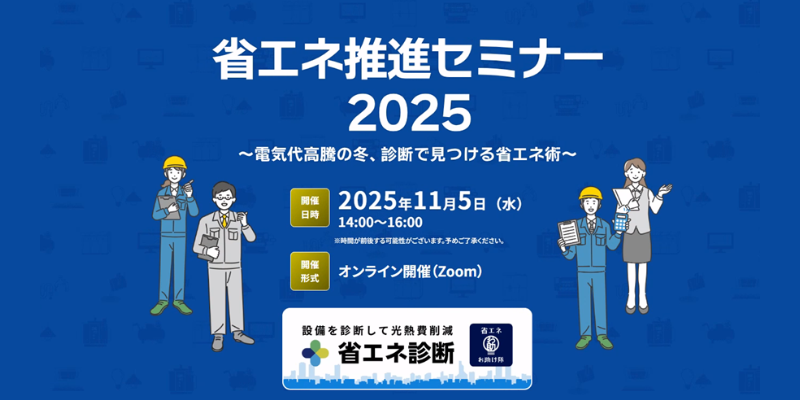 令和7年11月5日(水)、一般社団法人環境共創イニシアチブが経済産業省資源エネルギー庁の補助事業の一環として中小企業等を対象とした「省エネ推進セミナー2025」を開催します。